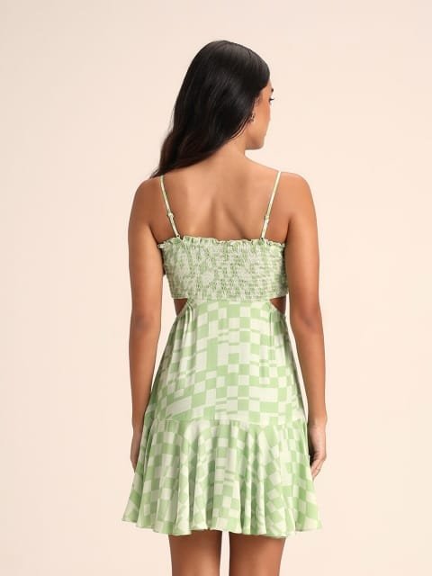 OnlyTrend Green & Off-White Checked Shoulder Strap Cut-Outs A-Line Dress