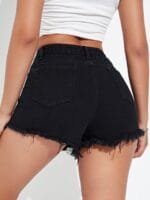 Black solid high-rise denim shorts, has 5 pockets, slip-on closure