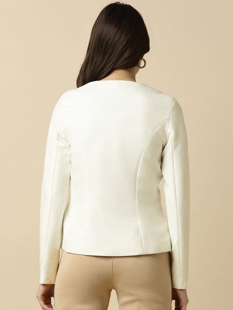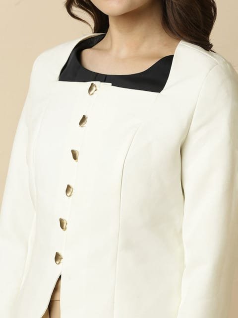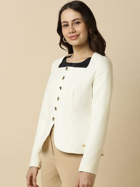 White solid regular-fit blazer, has a square shaped shawl collar, long sleeves, single-breasted with button closure