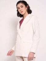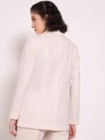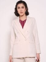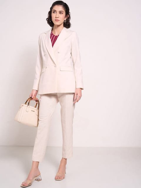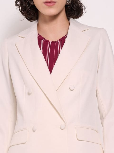 Off white solid regular-fit formal blazer, has a notched lapel collar, double-breasted with button closure, long sleeves, two flap pockets, and straight back hem