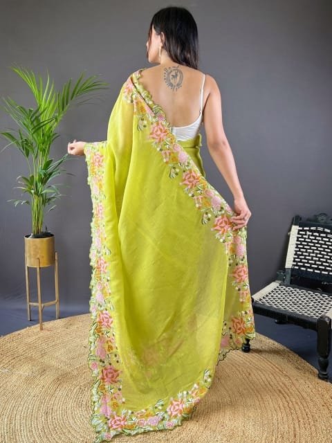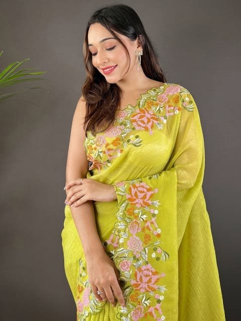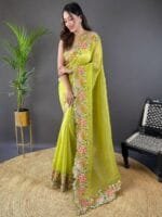 This emerald green tissue saree exceeded my expectations! The delicate embroidery work catches light beautifully, creating subtle shimmer as you move. What impressed me most was the intricate floral threadwork along the pallu – it’s clearly handcrafted with attention to detail.