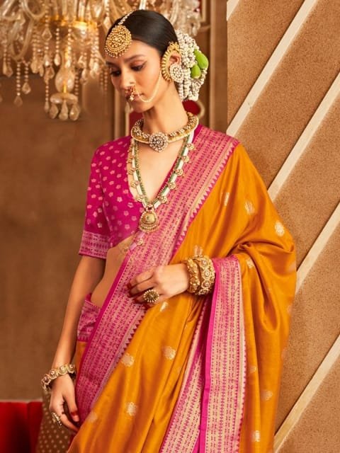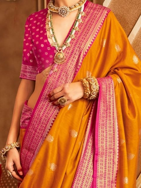 The blouse worn by the model might be for modelling purpose only. Check the image of the blouse piece to understand how the actual blouse piece looks like.