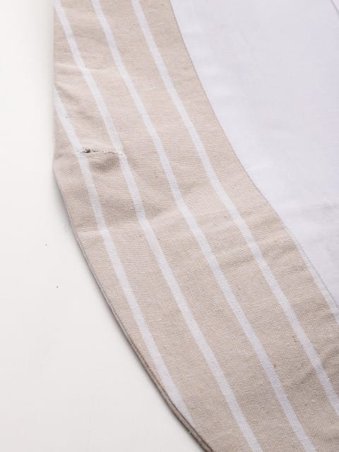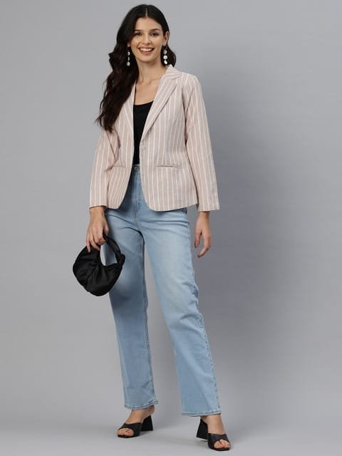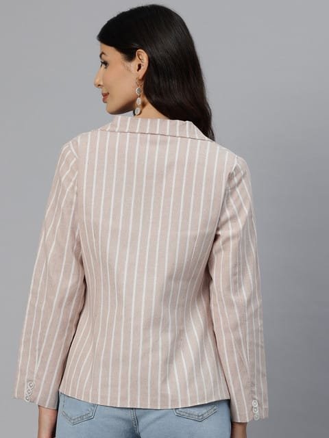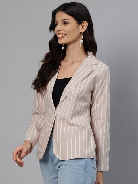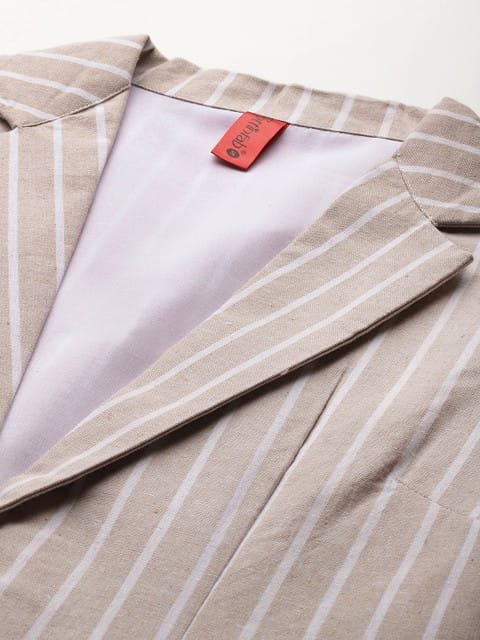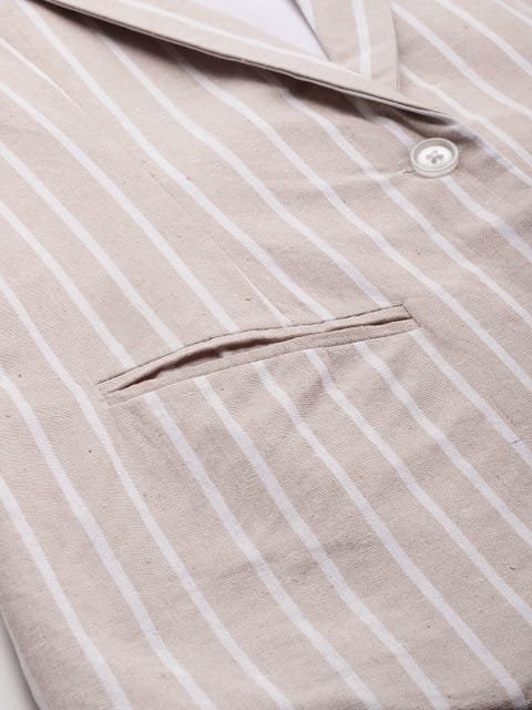 Beige & White striped pure cotton blazer, has a notched collar, single-breasted with single button closure, long sleeves, two pockets, and a straight hem