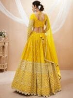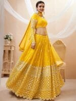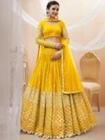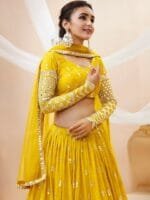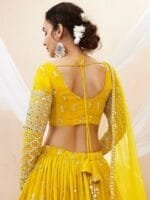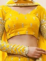 Yellow and gold-toned embroidered lehenga choli with dupatta, mirror work