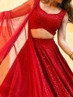Lehenga(Semi-Stitched) Flair : 3.50 mtr, waist-43″, height-43″; Blouse(Unstitched) : 1.0 mtr”; Dupatta Length: 2.50 mtr