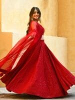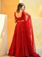 Red embroidered lehenga choli with dupatta, sequinned
