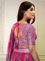 Pink and green embroidered unstitched blouse, has a v-neck, short sleeves, pink and green printed semi-stitched lehenga, flared hem