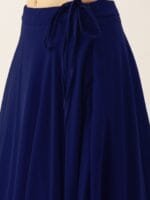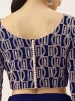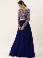 Navy Blue and gold-toned embroidered unstitched blouse, has a round neck, long sleeves,Navy blue and gold-toned solid semi-stitched lehenga, flared hem