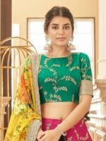 Lehenga(Semi-Stitched) Flair : 3.5 mtr, waist-43″, height-43″; Blouse(Unstitched) : 1 mtr”; Dupatta Length: 2.30 mtr