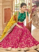 Pink and yellow embroidered lehenga choli with dupatta, zari