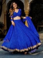 Blue and gold-toned printed lehenga choli with dupatta, has leheriya technique and gotta patti