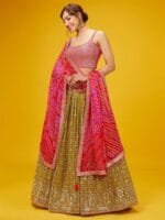 Green and pink embroidered lehenga choli with dupatta, sequinned