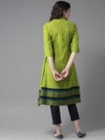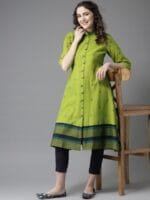This breathable and stylish kurta from HERE&NOW is a must-have item for any wardrobe. Dress up for your next family event by pairing this green piece with your best Kolhapuris and simple jewellery.