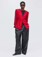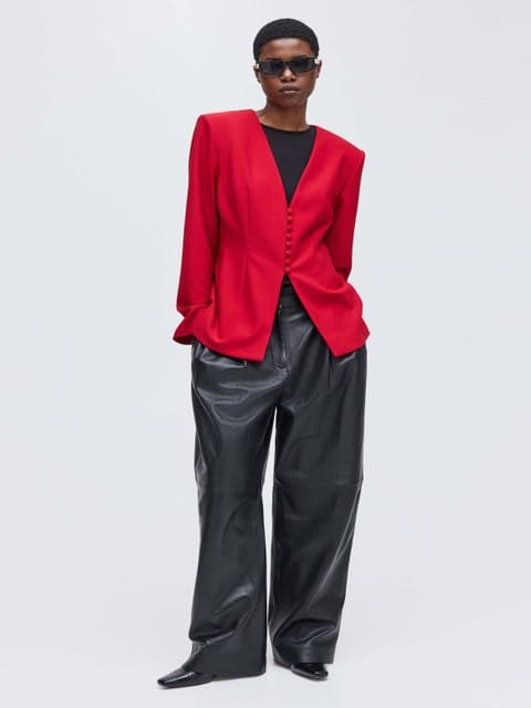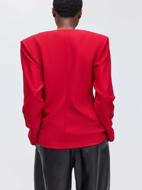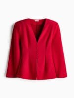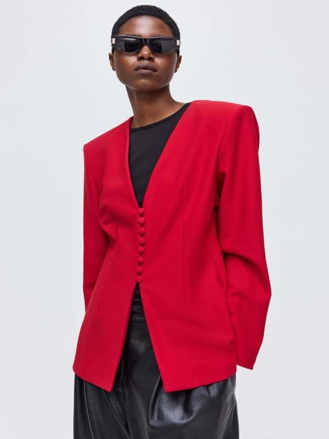 Single-breasted blazer in heavy jersey with strong shoulder pads, a deep V-neckline, covered buttons at the front and a nipped-in waist for a defined hourglass silhouette.