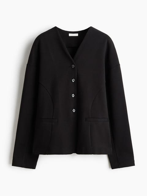Fitted blazer in heavy jersey with a V-neckline and buttons down to the waist. Princess seams at the front and back, fake welt pockets at the front and dropped shoulders.