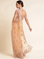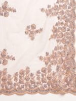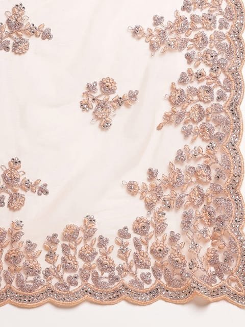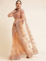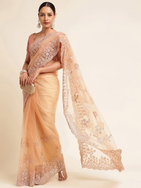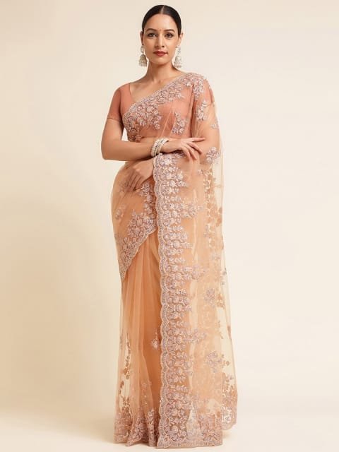 This delicate saree is exactly how it is shown down right to the color(dusty mauve) & you can play with inner skirt color of your choice. It is lightweight & pretty, though not neat. The acrylic stones are glued whereas the zari & anchor thread embroidery is secured with a sewing pattern on the reverse side. It includes a 35-inch embroidered border for the blouse. Prepare to be glitter bombed & possible skin irritation with movement. Overall, a good buy if discounted! (in picture: trial with mauve/purple traditional underskirt along with leisure wear top)