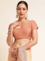 The blouse worn by the model might be for modelling purpose only. Check the image of the blouse piece to understand how the actual blouse piece looks like.