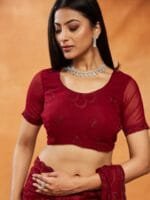 The blouse worn by the model might be for modelling purpose only. Check the image of the blouse piece to understand how the actual blouse piece looks like.