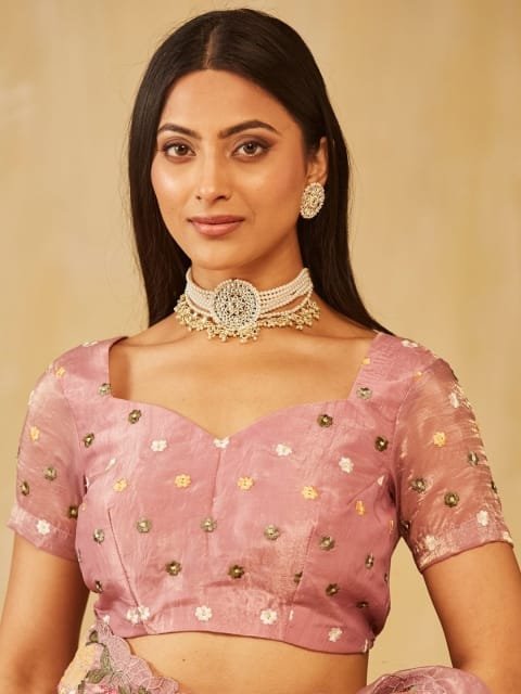The blouse worn by the model might be for modelling purpose only. Check the image of the blouse piece to understand how the actual blouse piece looks like.