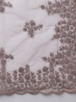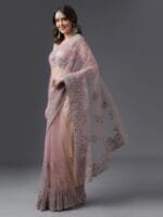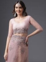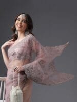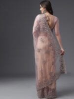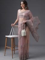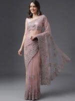 This delicate saree is exactly how it is shown down right to the color(dusty mauve) & you can play with inner skirt color of your choice. It is lightweight & pretty, though not neat. The acrylic stones are glued whereas the zari & anchor thread embroidery is secured with a sewing pattern on the reverse side. It includes a 35-inch embroidered border for the blouse. Prepare to be glitter bombed & possible skin irritation with movement. Overall, a good buy if discounted! (in picture: trial with mauve/purple traditional underskirt along with leisure wear top)