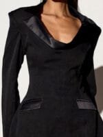 Black solid formal blazer, has a notched lapel, long sleeves, two flap pockets