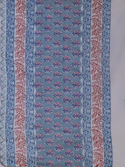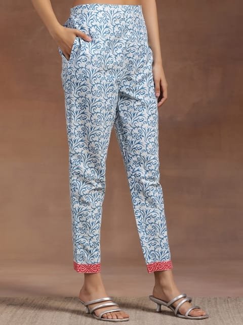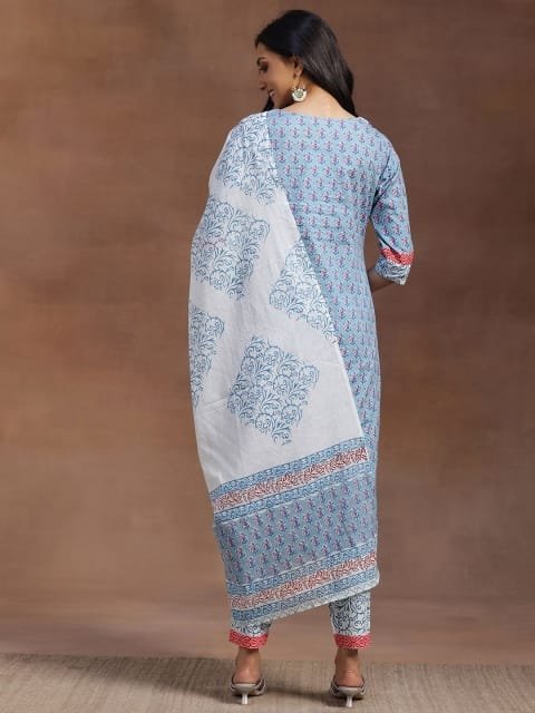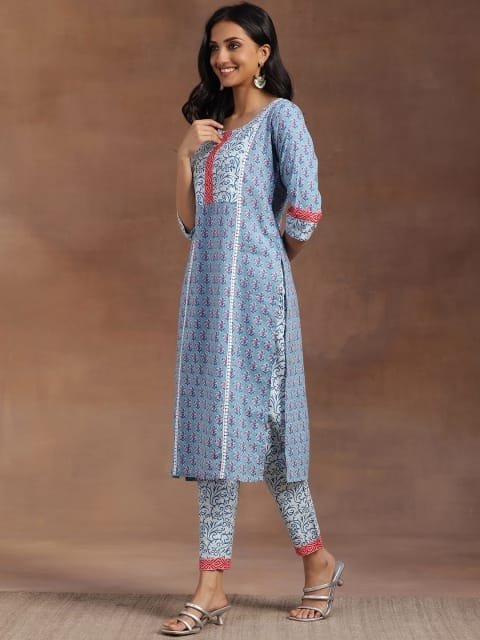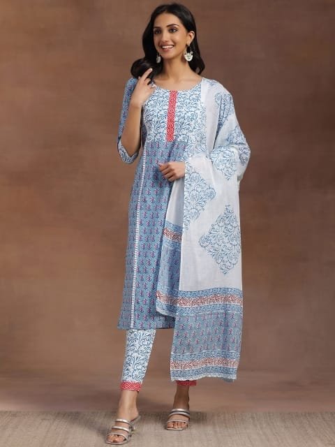 Our 3-piece blue printed cotton suit set features a straight-fit floral print kurta with a round neckline and three-quarter sleeves, straight pants with a partially elasticated waistband and roomy pockets, and a dupatta in a complementing print. Elevated with delicate fabric and lace-trim detailing, this smart style is perfect for work and beyond.