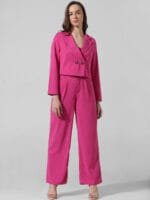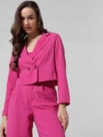 Pink solid cropped tailored-fit casual blazer, has a notched lapel collar, long sleeves, double-breasted with 2 button closure and a ventless back hem