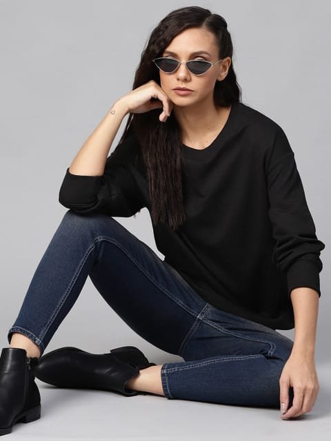 Black solid boxy sweatshirt, has a round neck, long drop-shoulder sleeves, straight hem