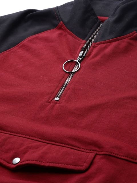 Maroon solid sweatshirt with colorblocked detail, has a mock collar, one pocket, long sleeves, half zipper closure, hem with toggle