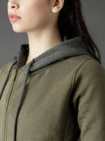 Olive Green solid sweatshirt, has a hood, two pockets, long sleeves, zip closure, straight hem