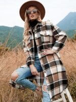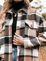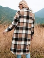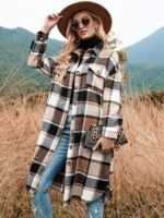 Khaki brown, black and white checked single-breasted overcoat, has a shirt collar, long sleeves, front button closure, two pockets, a straight hem
