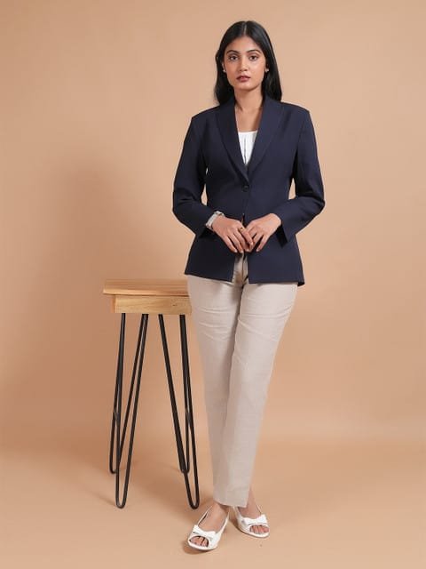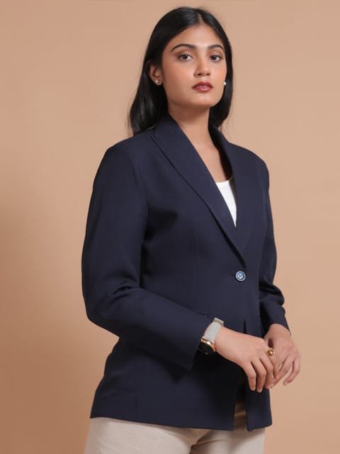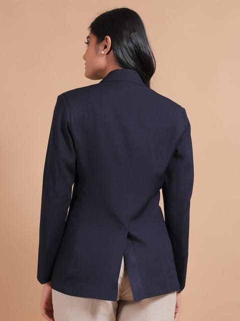 Navy blue solid regular-fit casual blazer, has a notched lapel, long sleeves, single-breasted with double button closure, two flap pockets and a single-vented back hem