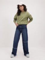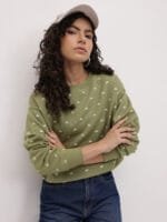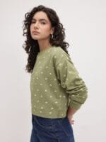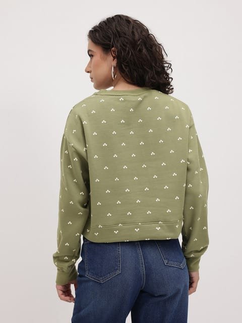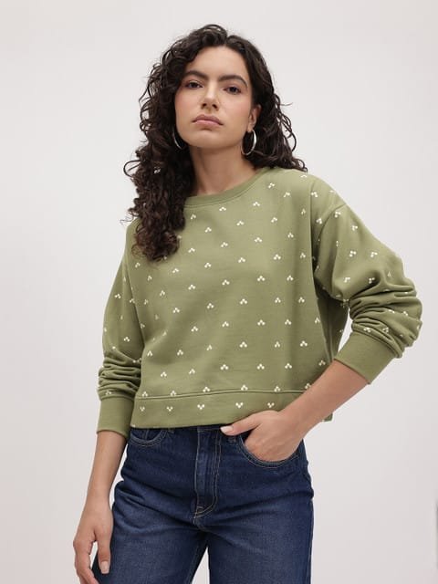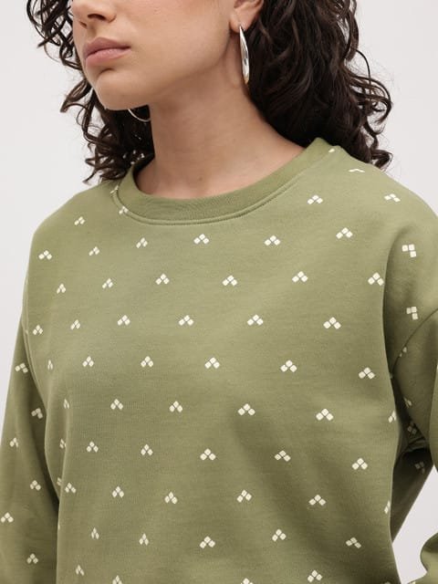 Green and White printed sweatshirt has a round neck, long sleeves, straight hem, fleece lined