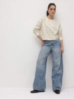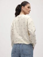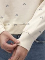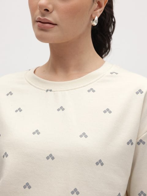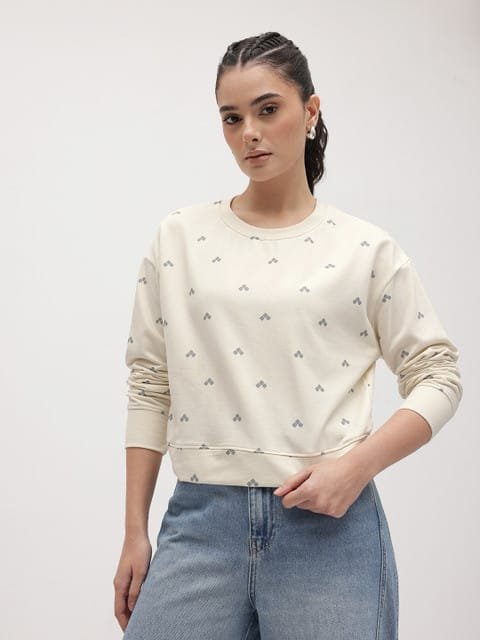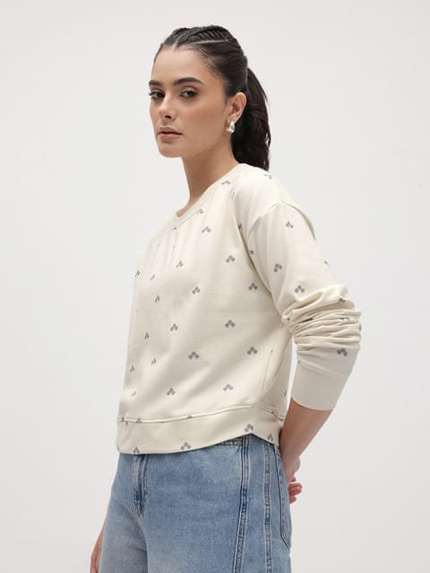 Cream-coloured printed sweatshirt has a round neck, long sleeves, closure, ribbed hem