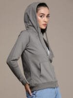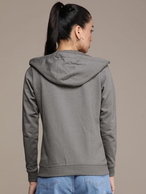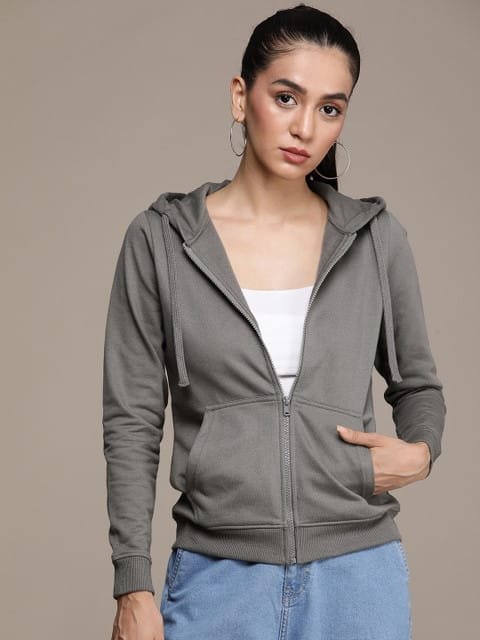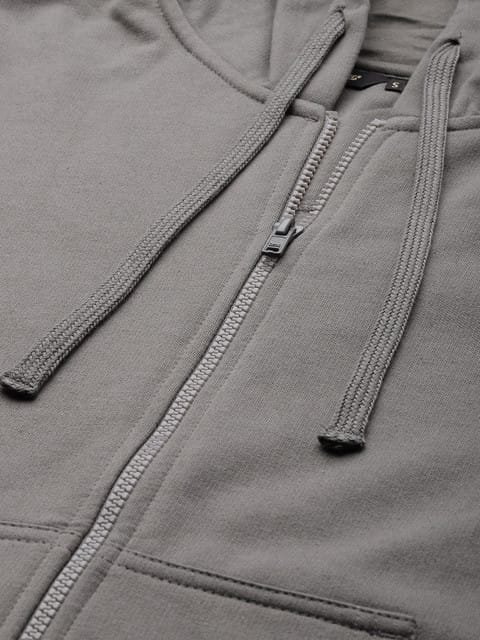 Grey solid sweatshirt has a hooded, 1 split kangaroo pocket, long sleeves, zip closure, straight hem