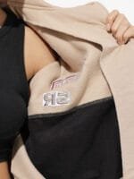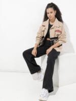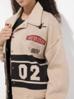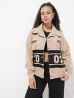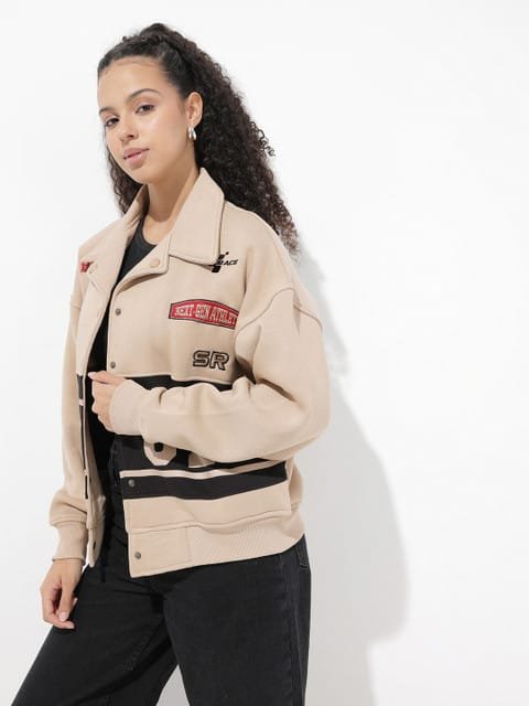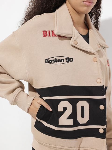 Tan, black and red typography printed sweatshirt has a shirt collar, 2 insert pockets, long sleeves, snap button closure, straight hem