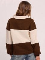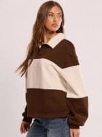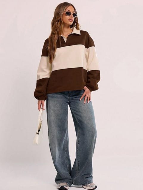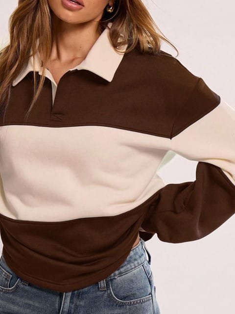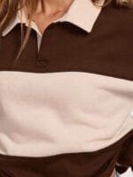 Brown and beige color-blocked sweatshirt, has a shirt collar with long sleeves and slip-on closure