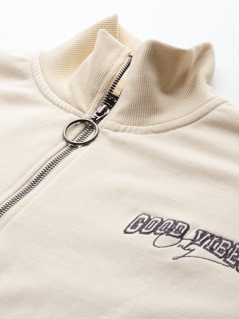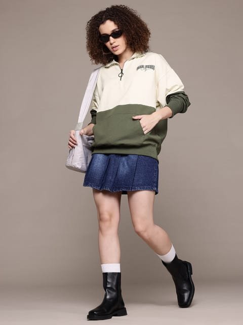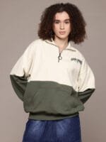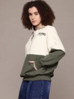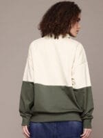 Cream & olive green colourblocked sweatshirt has a mock collar, 1 kangaroo pocket pockets, long drop-shoulder sleeves, half zipper closure, ribbed hem