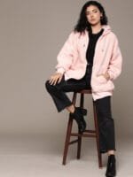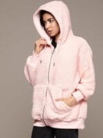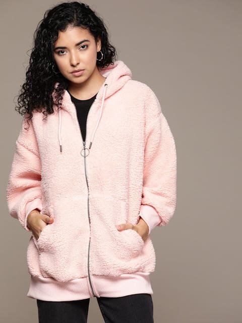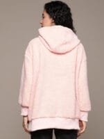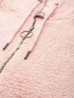 Peach-coloured solid sherpa sweatshirt, has a hood, 2 insert pockets, long sleeves, zip closure, ribbed hem
