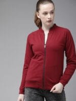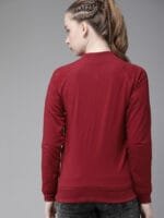 Maroon solid sweatshirt, has a mandarin collar, two pockets, long sleeves, zip closure, straight hem