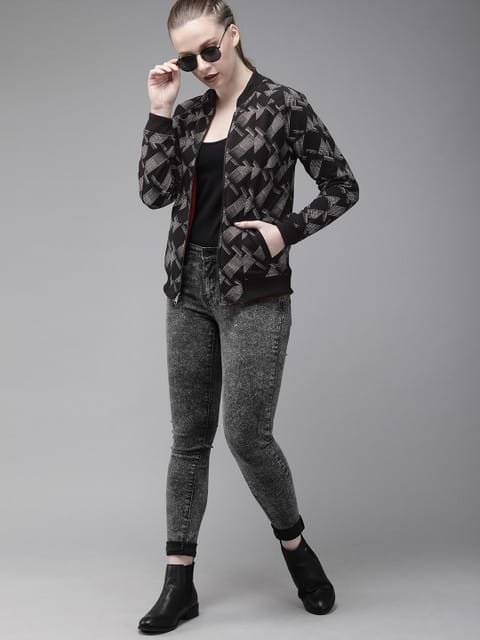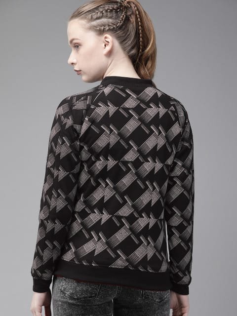 Black and grey printed sweatshirt, has a mandarin collar, two pockets, long sleeves, zip closure, straight hem