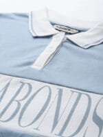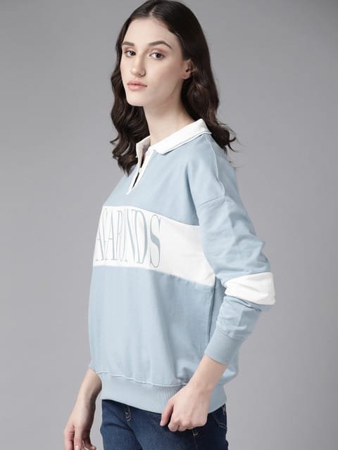 Blue & white striped sweatshirt, has a shirt collar, typography print detail on chest, long drop-shoulder sleeves, button closure, and ribbed hem