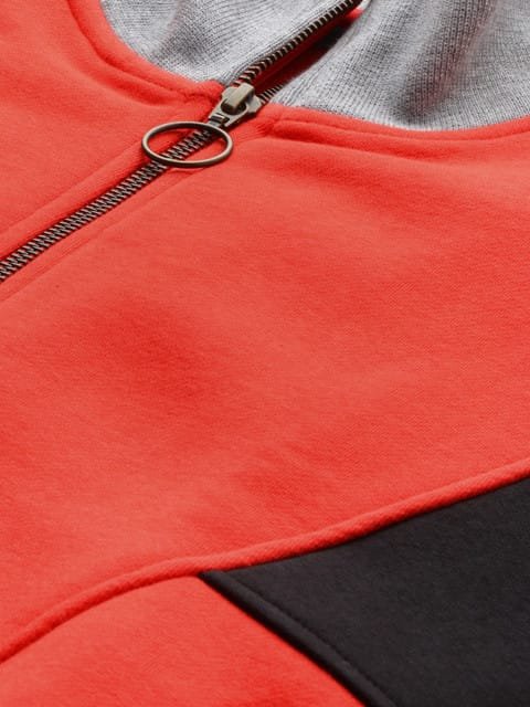 Coral orange solid front-open sweatshirt, has a mock collar, long sleeves, straight hem
