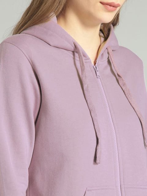 Lavender solid sweatshirt, has a hood, two pockets, long sleeves, zip closure, straight hem