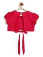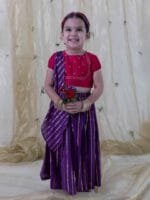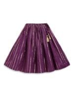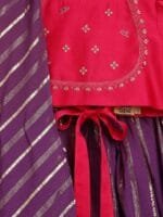 Purple and pink embroidered ready to wear blouse, has a round neck, short sleeves, purple and pink woven design ready to wear lehenga, flared hem