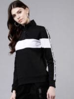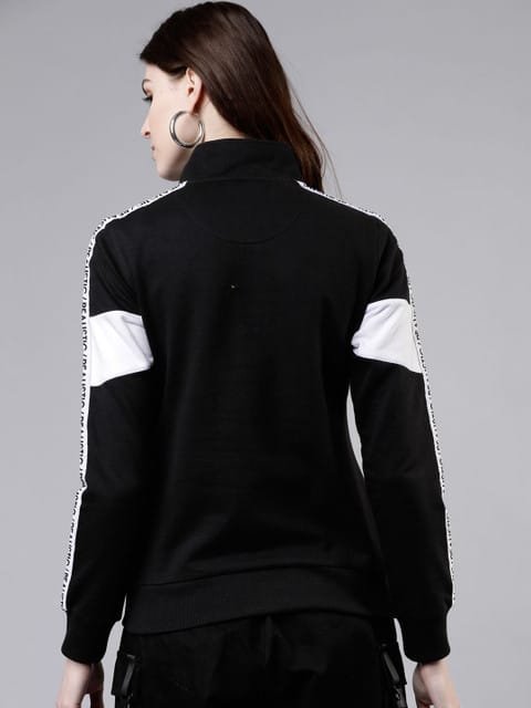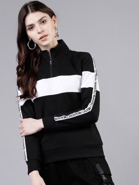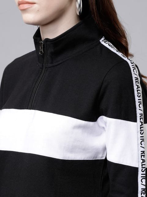 Black and white colourblocked pullover sweatshirt, has a high neck, long sleeves, zip closure, straight hem