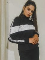 This jacket is excellent! The black and white contrast is sharp, and the quarter-zip style is practical. The material looks very comfortable and perfect for everyday wear. The sleeve detailing adds a great sporty touch