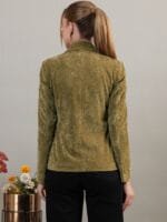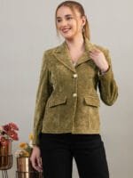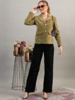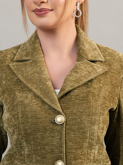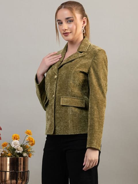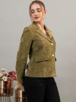 Green and gold-toned solid blazer, has a notched lapel, long sleeves, single-breasted with double button closure, two flap pockets, one welt pocket and a double-vented back hem